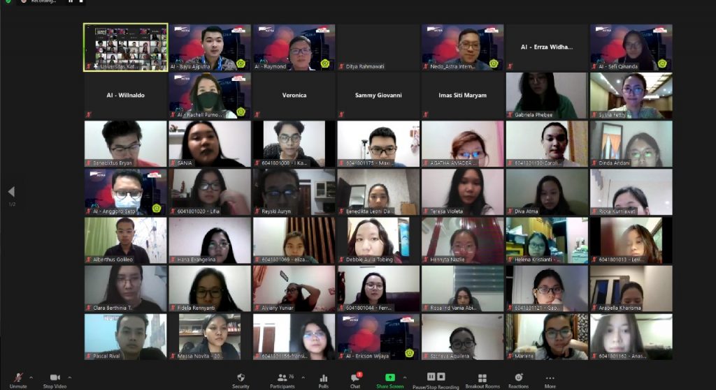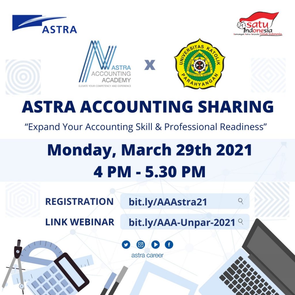 Senin, 29 Maret 2021 Program Studi Akuntansi FE UNPAR bekerja sama dengan Astra mengadakan acara sosialisasi Astra Accounting Academy. Materi ini dibawakan oleh Bapak Raymond Kurniawan (Accounting Division Head – PT Astra International Tbk), Ibu Ditya Alfa Rahmawati (Accounting Dept. Head) dan Bapak Emanuel Boniara Nedo (Recruitment & Assessment Centre Analyst). Astra Accounting Academy merupakan project based internship secara virtual selama 4 bulan yang dirancang khusus bagi mahasiswa Akuntansi. Melalui pengembangan dalam bentuk in class training, on the job training, mentorship program dan career preparation untuk mempersiapkan mahasiswa Program Studi Akuntansi menjadi Professional Accountant.