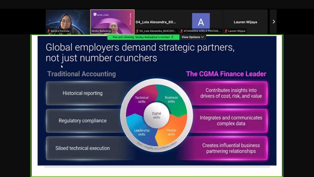 Dalam sesi ini, peserta diperkenalkan pada transformasi peran akuntan yang kini tidak lagi terbatas pada pelaporan dan kepatuhan, tetapi berkembang menjadi strategic business partner yang berperan dalam pengambilan keputusan bisnis. Hal ini sejalan dengan kerangka kompetensi yang dikembangkan oleh Association of International Certified Professional Accountants, yang menekankan integrasi kemampuan teknis, bisnis, digital, serta kepemimpinan.