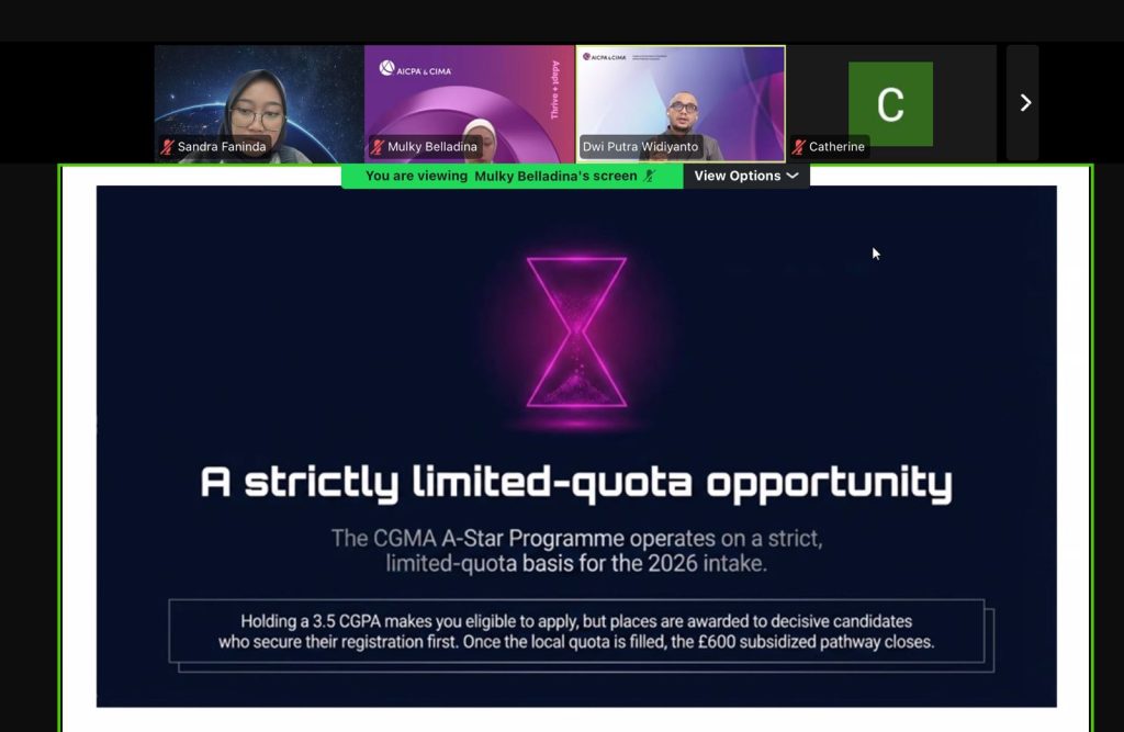Bandung, 14 April 2026 — Chartered Institute of Management Accountants (CIMA) bersama AICPA menyelenggarakan kegiatan Info Session CIMA A-Star Program pada Selasa, 14 April 2026 pukul 16.00–17.00 WIB secara daring. Kegiatan ini diikuti oleh mahasiswa yang tertarik untuk memahami pengembangan karier di bidang akuntansi manajemen global.