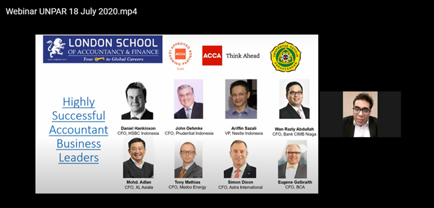 This online seminar is a collaboration between UNPAR Accounting Study Program with ACCA (Association of Chartered Certified Accountants) and LSAF (London School of Accountancy and Finance) in order to provide an overview of the importance of the accounting profession in the future. Speakers at the online seminar consisted of: 1) Mr. Hamfri Djajadikerta, Drs., Ak., MM presented material on “The Accountant Profession in the Era of the Industrial Revolution 4.0”; 2) Mr. Manish Gidwani, MSc, ACCA presented material on “Explore ACCA Complete Business Leadership Framework for Industry 4.0 Disruption”. The moderator of this event was Ms. Tyas Kanti, ACCA ALP Campus Manager LSAF Global.