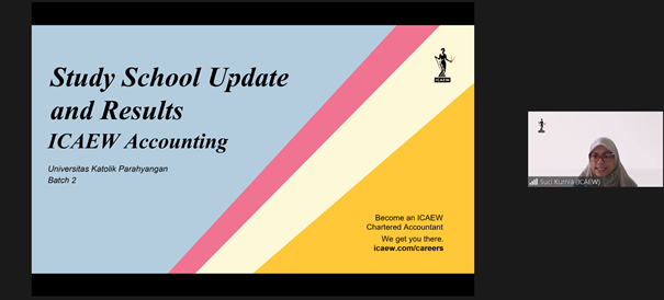 On Thursday, August 26, 2021, at 13.00, a discussion was held between the Accounting Study Program of UNPAR’s Faculty of Economics and ICAEW. The meeting was attended by Dr. Sylvia Fettry EM, S.E., S.H., M.Si, Ak, CA (Head of Accounting Department), Ms. Felisia, S.E., M.Ak. (Head of Accounting Study Program), Dr. Paulina Permatasari, SE, M.Ak, CMA, CSRS, CSRA (Head of Accounting Study Center), Puji Astuti R., S.E., M.Ak., Ak (Head of Accounting Laboratory), Mr. Andika Wardana (Business Development Manager of ICAEW), and Ms. Suci Kurnia (Business Development Executive of ICAEW). The meeting discussed several things, such as the mock exam results of exam preparation classes, preparation for accreditation at the certificate level, and the continuation of the sponsorship program. ICAEW is one of UNPAR’s partners in organizing exam preparation classes to obtain a certificate in Accounting. This is the second year ICAEW has provided full support for selected UNPAR Accounting Study Program students. Forms of support from ICAEW include the ICAEW registration fee, learning materials, tuition, and exam fees. It is expected that with this program, students can obtain better competence and certification that has been recognized around the world.
