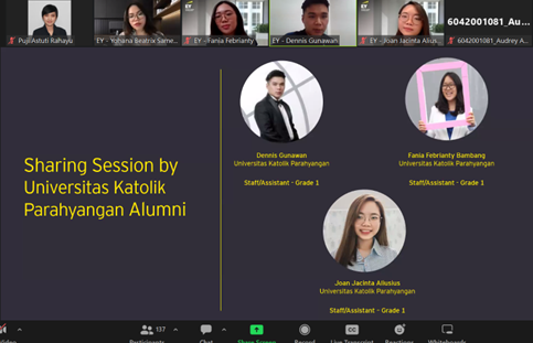 Jumat, 3 Juni 2022 Kantor Akuntan Publik Purwantono, Sungkoro, dan Surja (EY Indonesia) mengadakan virtual campus visit yang terdiri dari dua acara, yaitu: pemaparan mengenai company profile dan recruitment. Acara dibuka dan ditutup oleh Bapak Ivan Prasetya, SE., MSM., M.Eng (Wakil Dekan Bidang Kemahasiswaan dan Alumni Fakultas Ekonomi). Acara EY Virtual Campus Visit diperuntukkan bagi mahasiswa tingkat akhir dan alumni Program Studi Akuntansi FE UNPAR. Materi company profile dipaparkan oleh Bapak Komala Widjaja (Assurance Service Partner-EY Indonesia). Acara ini merupakan kesempatan yang baik bagi mahasiswa Program Studi Akuntansi untuk memperoleh informasi dan mendapatkan peluang untuk bekerja sebagai auditor di KAP EY Indonesia bahkan sebelum lulus studi.