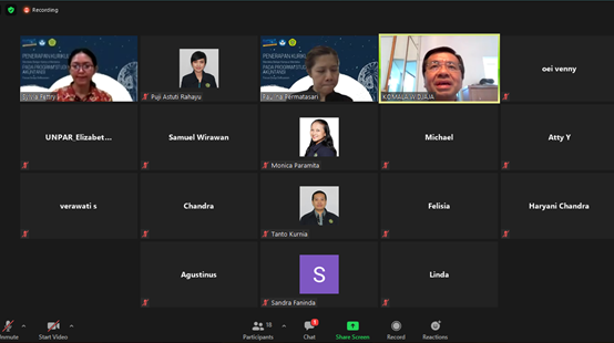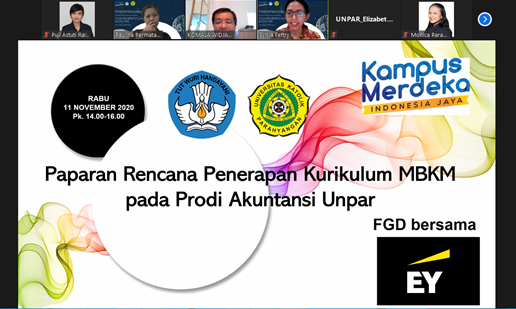 Dalam rangka menyiapkan mahasiswa menghadapi perubahan sosial, budaya, dunia kerja, dan kemajuan teknologi yang pesat, kompetensi mahasiwa harus disiapkan untuk lebih sesuai dengan kebutuhan zaman. Link and match tidak hanya dengan dunia industri dan dunia kerja tetapi juga dengan masa depan yang berubah dengan cepat. Perguruan Tinggi dituntut untuk dapat merancang dan melaksanakan proses pembelajaran yang inovatif agar mahasiswa dapat meraih capaian pembelajaran mencakup aspek sikap, pengetahuan, dan keterampilan secara optimal dan relevan. Dalam upaya untuk mencapai hal tersebut, Program Studi Akuntansi mengadakan Focus Group Discussion bersama dengan Bapak Indrajuwana Komala Widjaja ( Assurance Service Partner EY Indonesia) dan dihadiri oleh dosen-dosen Program Studi Akuntansi Unpar, pada tanggal 11 November 2020. Bapak Indrajuwana juga merupakan alumni dari Program Studi Akuntansi Unpar.