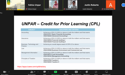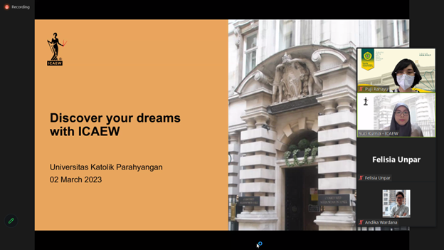 ICAEW (The Institute of Chartered Accountants in England and Wales) merupakan salah satu Lembaga profesi akuntansi yang diakui oleh dunia. ICAEW berdiri di Inggris pada tahun 1880 dan memiliki anggota yang tersebar di penjuru dunia. Berbagai kerjasama telah dilaksanakan antara UNPAR dengan ICAEW, seperti: seminar internasional, beasiswa, ambassador, dan info session. Kali ini, info session diselenggarakan pada tanggal 2 Maret 2023, dengan tujuan untuk memberikan pemahaman kepada mahasiswa mengenai biaya dan benefit yang akan diperoleh mahasiswa. Selain itu juga dipaparkan mengenai kesempatan magang di Deloitte Singapore dan Malaysia, beberapa modul yang dapat di waived karena Program Studi Akuntansi Unpar telah berhasil lulus akreditasi internasional yang diselenggarakan oleh ICAEW, dan jadwal kelas persiapan. Acara ini dihadiri oleh Bapak Andika Wardana (Business Development Manager – ICAEW), Ibu Suci Kurnia (Business Development Executive – ICAEW), Ibu Felisia. SE., M.Ak. (Ketua Program Studi Akuntansi – UNPAR), Ibu Puji Astuti (Kepala Laboratorium Akuntansi – UNPAR), dan mahasiswa Program Studi Akuntansi Unpar.