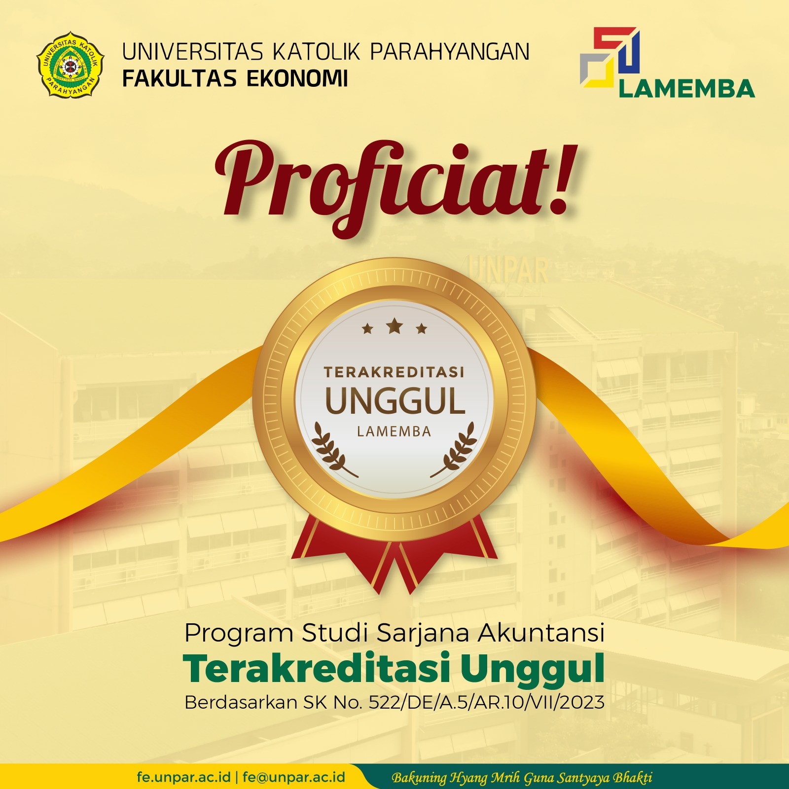 Puji syukur kami panjatkan ke hadirat Tuhan yang Maha Esa atas keberhasilan Program Studi Sarjana Akuntasi Fakultas Ekonomi Universitas Katolik Parahyangan (FE UNPAR) yang mempertahankan status akreditasi A dari BAN-PT menjadi akreditasi UNGGUL dari Lembaga Akreditasi Mandiri Ekonomi, Manajemen, Bisnis dan Akuntansi (LAMEMBA), dengan SK No. 522/DE/A.5/AR.10/VII/2023 berlaku mulai 17 Juli 2023 sampai dengan 17 Juli 2028.