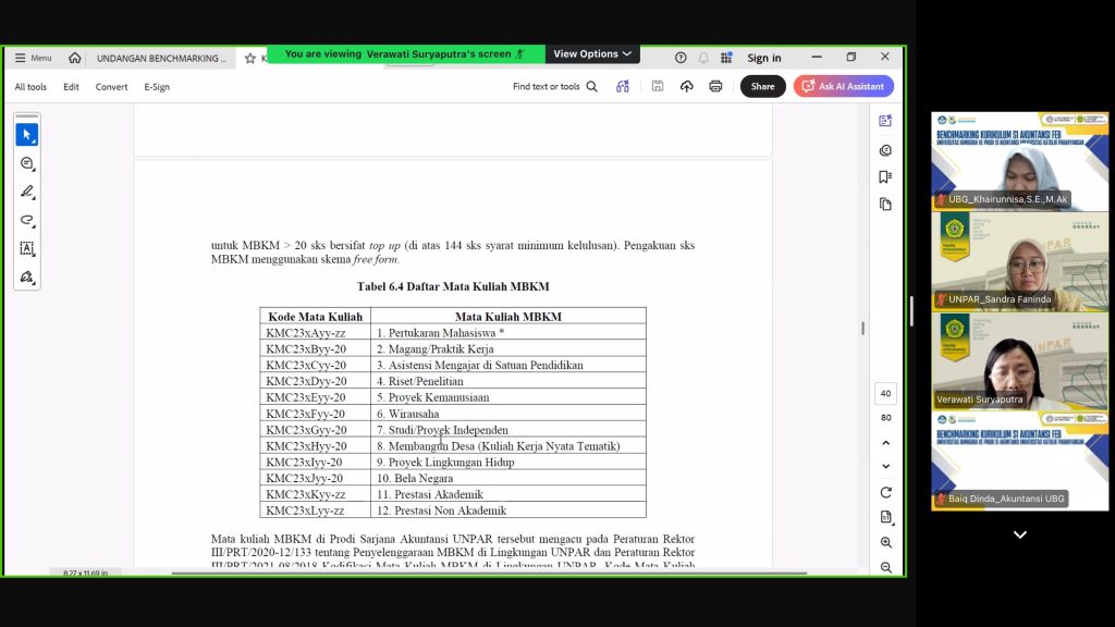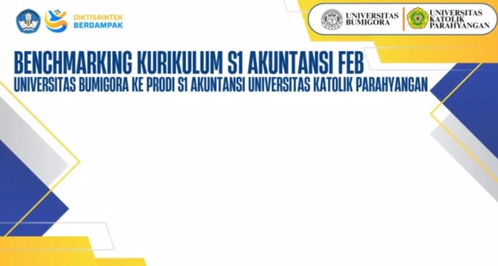 Program Studi S1 Akuntansi, Universitas Bumigora, melaksanakan kegiatan benchmarking kurikulum bersama Program Studi S1 Akuntansi Universitas Katolik Parahyangan (UNPAR) pada Senin, 20 April 2026 secara daring. Kegiatan ini menjadi ruang kolaboratif dalam penguatan kurikulum berbasis Outcome-Based Education (OBE) bagi kedua pihak.