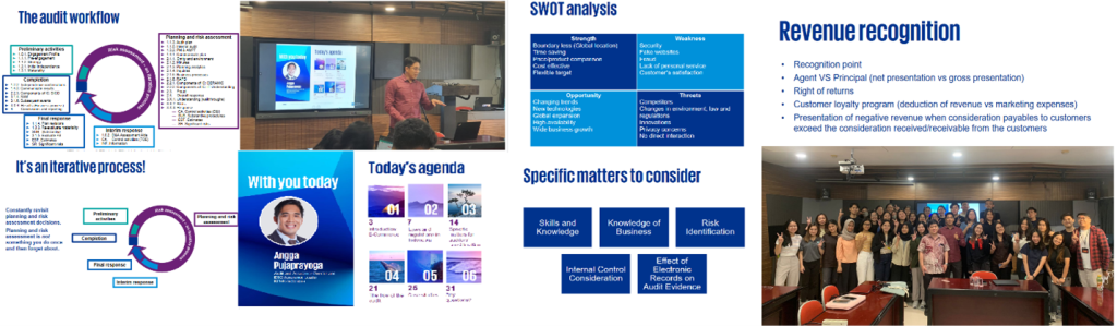 Melalui sesi kelas ini, mahasiswa mempelajari area-area yang menjadi fokus dalam melakukan audit industri e-commerce. Area-area tersebut terdiri dari revenue recognition, website development cost, dan valuation of inventories. Selain itu, pada pertemuan ini juga membahas mengenai hal-hal khusus yang harus dipertimbangkan dalam mengaudit industri e-commerce, yaitu pengetahuan mengenai informasi dan teknologi, pengetahuan mengenai bisnis yang dijalankan perusahaan, dan internal control perusahaan tersebut.