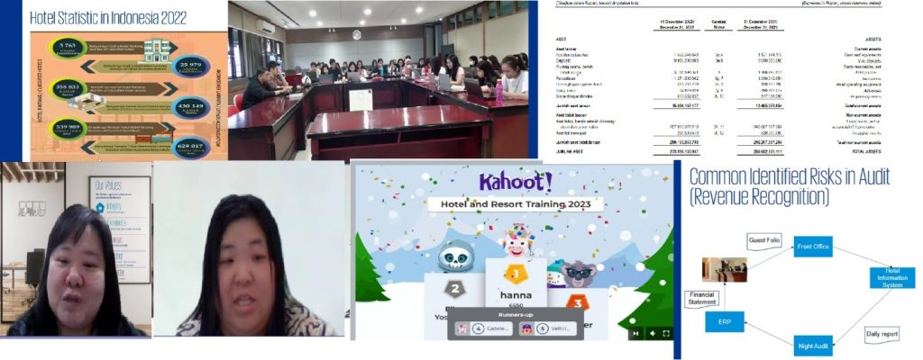 Melalui sesi kelas ini, mahasiswa mempelajari apa saja area-area yang menjadi fokus dalam melakukan audit industri Hotel and Resort. Area-area tersebut terdiri dari karakteristik Hotel and Resort, tipe industri, statistik hotel dan pertumbuhan bisnis perhotelan di Indonesia, terminologi yang digunakan dalam industri Hotel and Resort, pajak dan peraturan yang berkaitan, Revenue Recognition dalam industri Perhotelan, risiko audit dalam industri Hotel and Resort, dan dampak Covid-19 terhadap industri Hotel and Resort. Selain itu, pada pertemuan ini juga diberikan lima pertanyaan study case yang mengacu pada Laporan Keuangan PT Eastparc yang perlu dijawab oleh seluruh mahasiswa melalui Kahoot. Sesi tanya jawab pada acara ini diselenggarkan di awal, tengah, dan akhir. Mahasiswa terlihat antusias mengajukan pertanyaan.