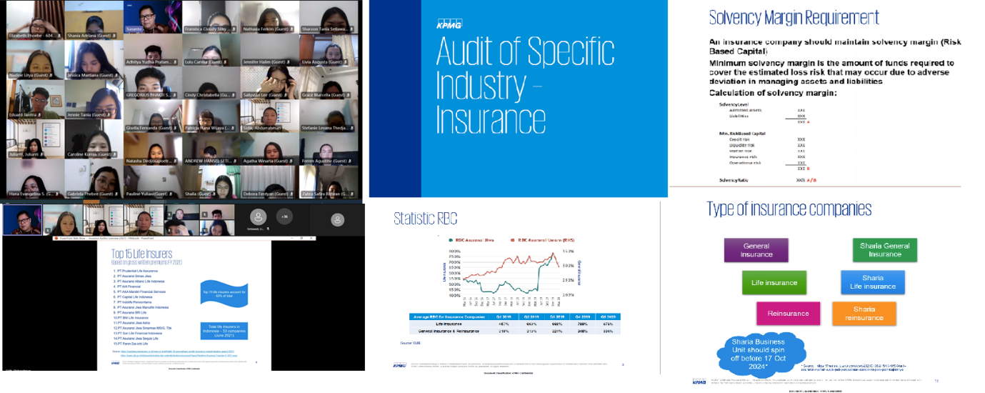 Pertemuan ke-9 Kelas Audit Industri Spesifik kali ini membahas mengenai audit di industri Asuransi yang dibawakan oleh Bpk Susanto selaku Head of Clients & Markets Insurance Practice Leader yang ditemani oleh Bpk Abdurrahman Sidik dan Ibu Julianti . Diawali dengan membagikan kuesioner singkat mengenai Industri Asuransi sehingga dapat diketahui sejauh mana pemahaman mahasiswa terkait asuransi. Asuransi adalah usaha menjual jasa proteksi . Asuransi terbagi menjadi 2 jenis yaitu asuransi jiwa dan asuransi umum ( asuransi kendaraan 20 %, asuransi kredit 21% , asuransi properti 27 % dan sisanya asuransi lainnya ) . 15 perusahaan terbesar di perusahaan asuransi jiwa menguasai 80 % premi kotor asuransi dan 15 perusahaan terbesar di perusahaan asuransi umum menguasai 65 % premi kotor asuransi. Oleh karena itu perlu ada regulasi yang mengatur dan melindungi para pihak karena mengumpulkan dan mengelola dana masyarakat (diatur oleh OJK Industri Keuangan Non Bank yang mengatur industri Asuransi, UU, KMK, POJK, SEOJK ).