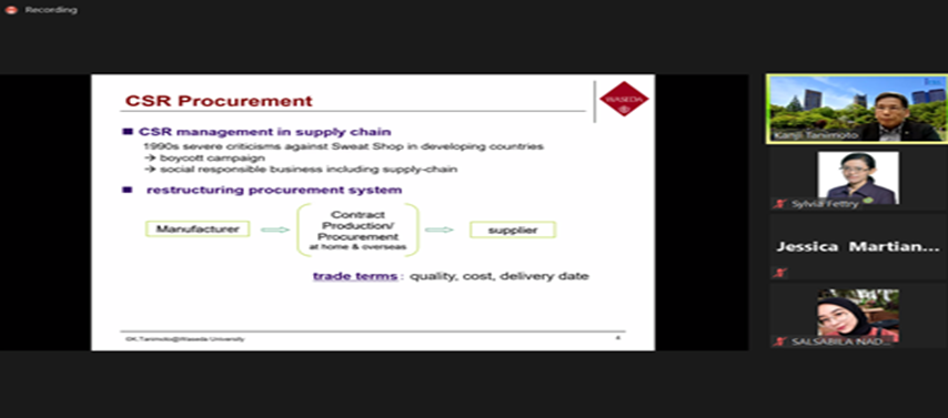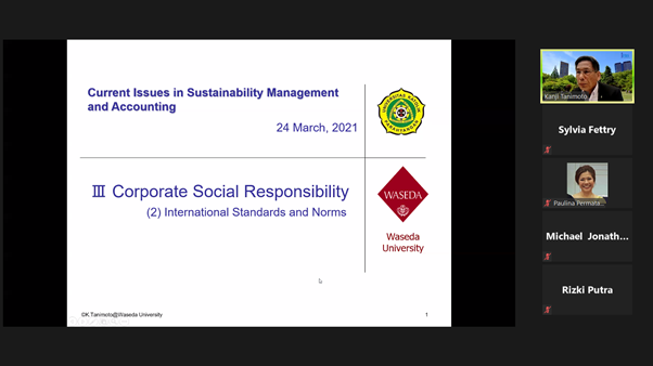 Kelas team teaching Mata Kuliah Kapita Selekta Akuntansi Manajemen dengan Topik Khusus Akuntansi dan Manajemen Keberlanjutan yang merupakan kolaborasi Program Studi Akuntansi Universitas Katolik Parahyangan Indonesia dengan School of Commerce Waseda University Japan. Kuliah Kapita Selekta ini diselenggarakan pada Semester Genap Tahun Akademik 2020/2021. Delapan pertemuan dari 16 maret 2021 s/d 31 Maret 2021 Mata Kuliah Kapita Selekta dibawakan oleh Prof. Kanji Tanimoto dengan materi sebagai berikut: Business and society, stakeholder management and practice, stakeholder engagement and the practice, corporate social responsibility – the definition and the background, corporate social responsibility – international standards, corporate social responsibility – strategic management, communicating CSR and reporting, supply chain management. Enam pertemuan sisanya dibawakan oleh Ibu Dr.Paulina Permatasari, SE., M.Ak., CMA., CSRS., CSRA.