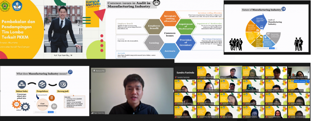 Para mahasiswa mendapatkan berbagai pengalaman ilmu dengan berbagai topik terkini yang relevan bagi lomba dan masa depan tim lomba tersebut dalam memasuki dunia kerja. Pada hari Senin, tanggal 9 Agustus 2021, dilangsungkan satu pembekalan secara online dengan mengundang alumni Akuntansi angkatan 2012, yaitu Bapak Yapi Owenley, SE. Beliau saat ini sebagai Assurance Manager – Consumer and Industrial Products and Services (CIPS) di PwC Tokyo Jepang .