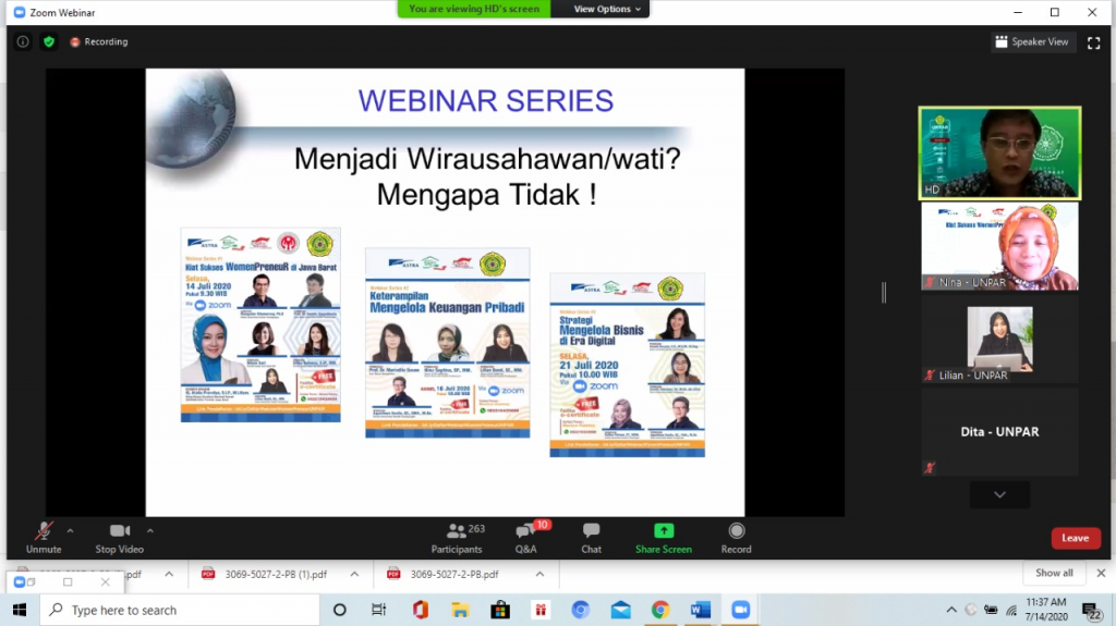 Seri 1 “Kiat Sukses Womenpreneur di Jawa Barat”, diselenggarakan pada Hari Selasa,14 Juli 2020, dengan pembicara: 1) Ibu Hj.Atalia Praratya Kamil, SIP, M.I.Kom, 2) Githa Nafeeza (Hachi Group), 3) Nilamsari (Kebab Baba Rafi), 4) Bapak Prof.Dr. Hamfri Djajadikerta . Moderator: Ibu Lilian Danil, SE, MM