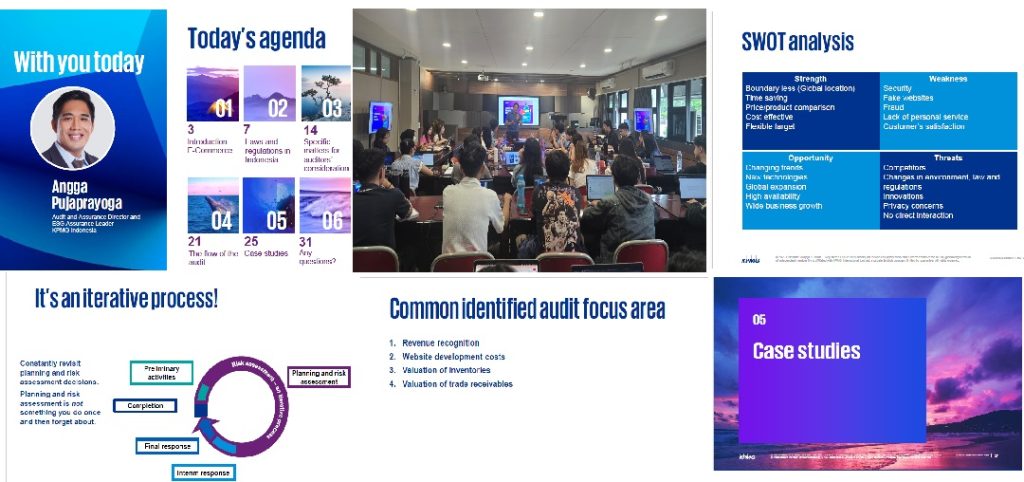 Topik kemudian berkembang pada aspek penting bagi auditor saat mengaudit perusahaan e-commerce, yaitu skills and knowledge, knowledge of business, risk identification, internal control consideration, serta effect of electronic records on audit evidence. Sebagai contoh, Pak Angga memaparkan contoh Traveloka, di mana auditor perlu memahami kapan pendapatan diakui apakah saat tiket dijual di platform, atau ketika pihak ketiga (seperti maskapai) melaksanakan kewajiban layanan. Hal ini menekankan bahwa pengakuan pendapatan dalam industri e-commerce sering kali lebih kompleks dibanding perusahaan konvensional, dan auditor harus memiliki pemahaman mendalam mengenai bisnis klien.