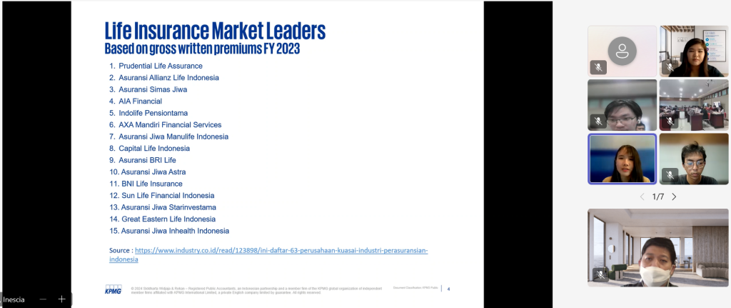 Pada pertemuan ketiga Kelas Audit Industri Spesifik (25/09/2024), yang dibawakan oleh Ibu Julianti dan Ibu Inescia, Audit Manager dari KPMG, topik yang dibahas adalah Audit Industri Asuransi. Pemaparan materi dimulai dengan membahas Industri Asuransi di Indonesia secara umum, termasuk pemimpin pasar asuransi di Indonesia dan regulasi-regulasi yang berlaku untuk industri ini.