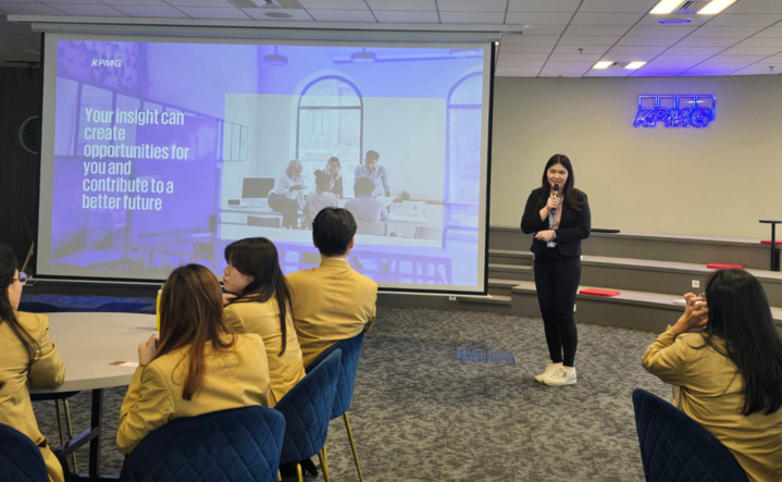 Acara dilanjutkan dengan pemaparan mengenai budaya kerja (work culture) di KPMG oleh Ibu Helina Clara selaku People, Performance, and Culture Assistant Manager. Beliau menjelaskan nilai-nilai, lingkungan kerja yang kolaboratif, terbuka akan perbedaan, serta peluang pengembangan karier yang ditawarkan oleh KPMG. Sesi ini memberikan gambaran nyata bagi mahasiswa tentang seperti apa rasanya bekerja di sebuah firma konsultasi global.