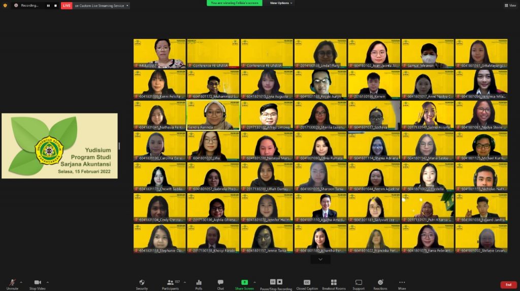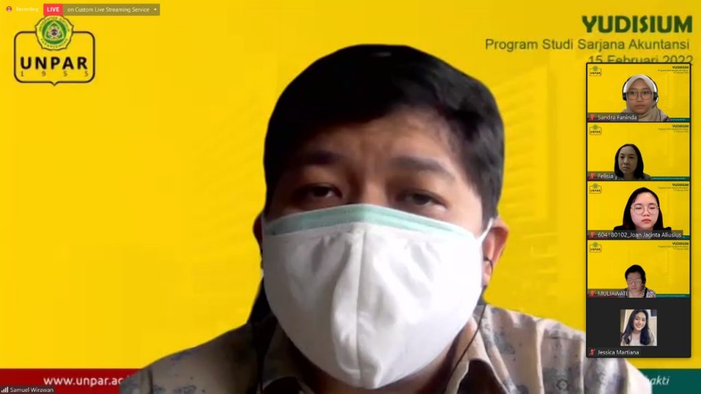 Selasa, 15 Februari 2022 Program Studi Sarjana Akuntansi FE UNPAR menyeleggarakan Acara Yudisium secara daring. Acara ini dihadiri oleh 141 lulusan Program Studi Sarjana Akuntansi, dosen-dosen dan tenaga kependidikan. Acara Yudisium diawali dengan pemutaran lagu Indonesia Raya, pembacaan doa dipimpin oleh Bapak Tanto Kurnia, S.T., M.A., M.Ak, pemberian kata sambutan oleh Ibu Dr. Sylvia Fettry EM., SE., SH.,M.Si., Ak., CA (Ketua Jurusan Akuntansi), penyampaian kesan dan pesan dari beberapa dosen. Selanjutnya pembacaan yudisium dipaparkan oleh Ibu Felisia, SE., M.Ak (Ketua Program Studi Sarjana Akuntansi). Berikutnya penyampaian pesan dan kesan dari perwakilan lulusan, yaitu William Asali (Ketua Himpunan Mahasiswa Program Studi Akuntansi) dan Natasha Dirdjosapoetro. Acara Yudisium ditutup dengan foto Bersama, doa penutup, dan ramah tamah. Berikut ini adalah daftar mahasiswa yang telah berhasil menyelesaikan studinya dengan peringkat yudisium Dengan Pujian: